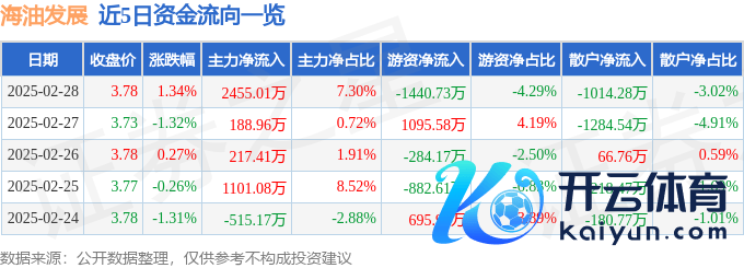 本站讯息,收尾2025年2月28日收盘,海油发展(600968)报收于3.78元,上升1.34%,换手率0.87%,成交量88.3万手,成交额3.36亿元。